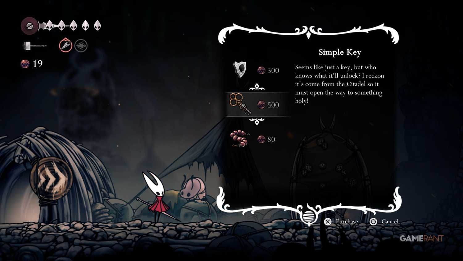 • The Simple Key: This is a mandatory item for unlocking the door to the Wormways. It can be purchased from the trader Pebb in the village of Bone Bottom for 500 Rosaries. If you are short on funds, a great early-game farming spot is in the Mosshome area, near the bench where you first find the map-maker Shakra.